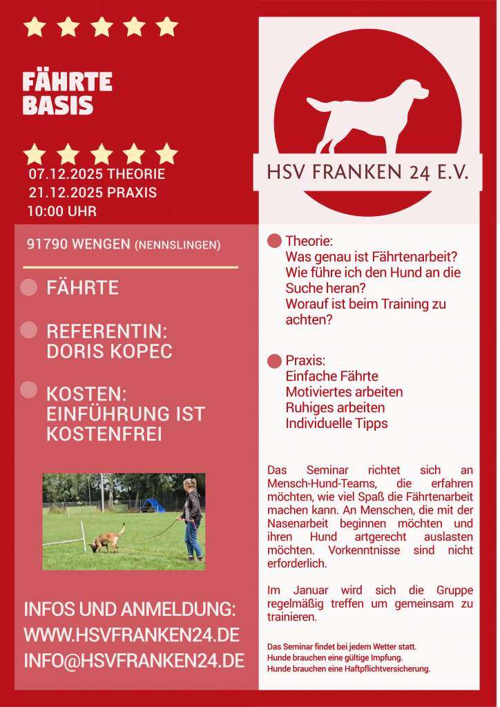 Zum Aufbau einer neuen Fährtengruppe im HSV Franken 24 e.V. gibt es eine Schnuppereinheit in Theorie und Praxis.