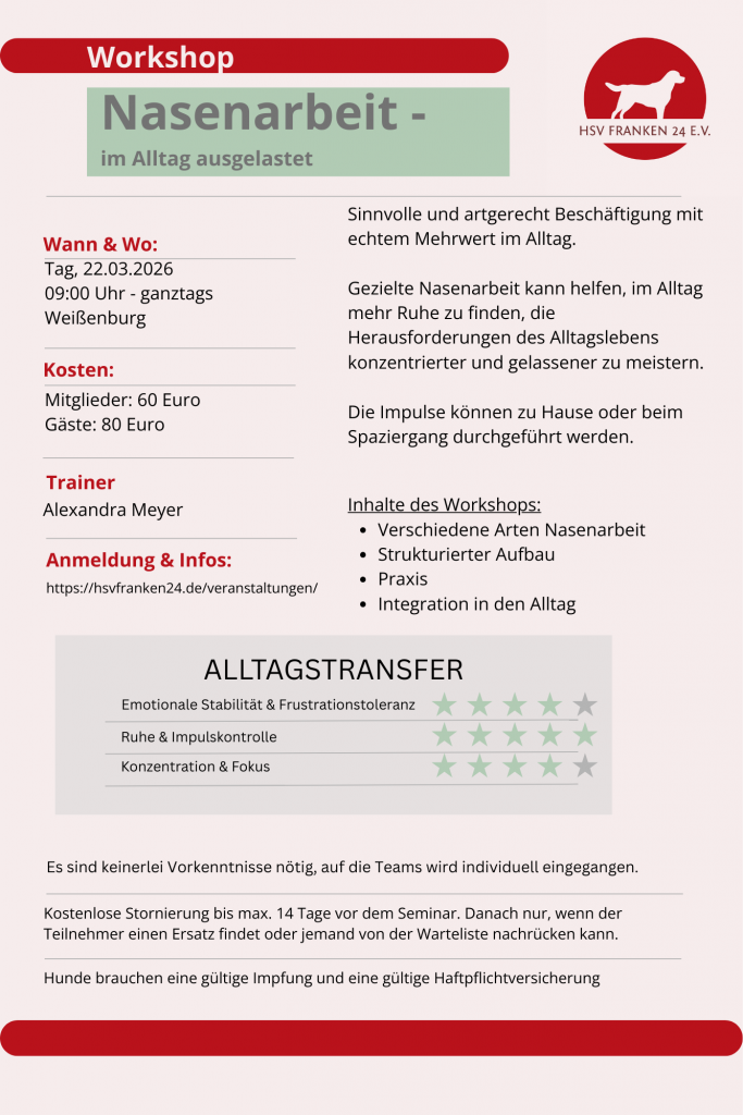In diesem Seminar zeigen wir, wie Nasenarbeit Familienhunde nicht nur sinnvoll beschäftigt, sondern ihnen hilft, zur Ruhe zu kommen, sich besser zu konzentrieren und Herausforderungen gelassener zu meistern. Du erfährst, warum Sucharbeit einen echten Mehrwert für den Alltag bietet, wie sie Impulskontrolle und Frustrationstoleranz fördert und mit einfachen, strukturierten Übungen problemlos in das tägliche Zusammenleben integriert werden kann – drinnen wie draußen, angepasst an Hund und Mensch.