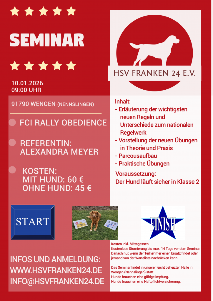 Das Seminar richtet sich an alle, die sich 2026 ins FCI einfuchsen wollen. Die Schilder und Besonderheiten werden erklärt und geübt. Tipps zum Aufbau vom Training mitgegeben.