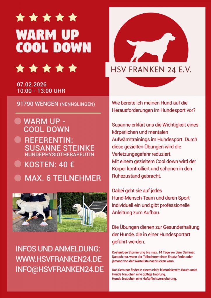 Vorabankündigung Januar/Februar 2026: Warm-up und Cool-down für Hunde ein Seminar mit der Hundephysiotherapeutin Susanne Steinke